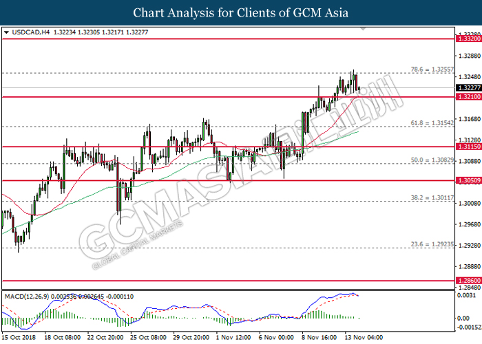 USDCAD, H4: USDCAD was traded lower following prior retracement from the higher levels. MACD which illustrate the formation of death cross suggests the pair to extend its losses after breaking the support level near 1.3210.