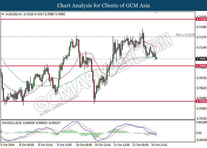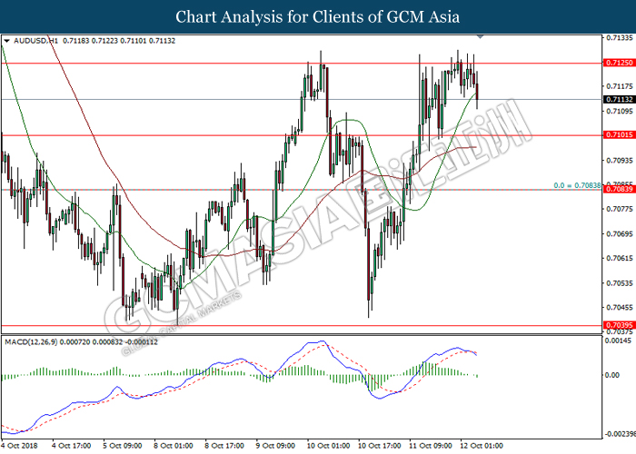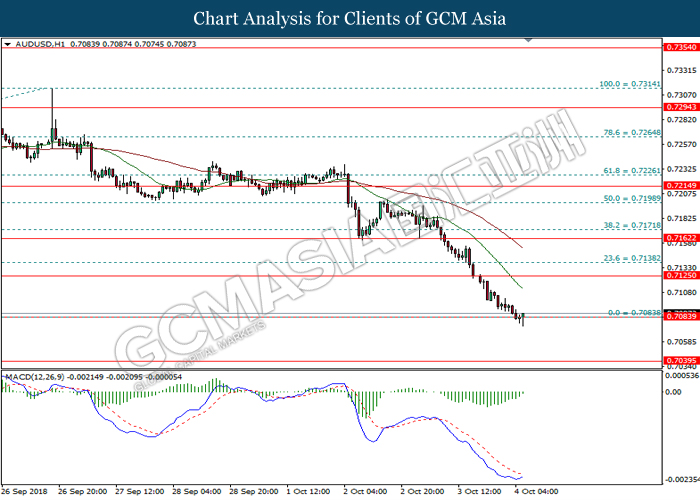 AUDUSD, H1: AUDUSD was traded lower following prior retracement from the resistance level 0.7125. MACD which display bearish momentum and the formation of a death cross suggest the pair to extend its retracement towards the support level 0.7100.