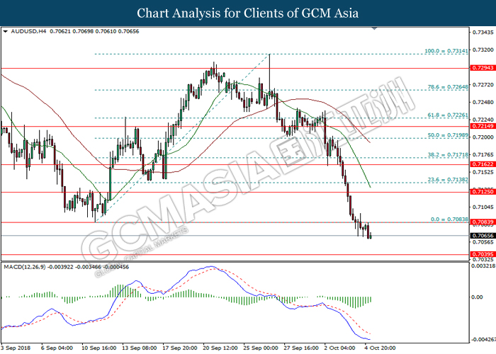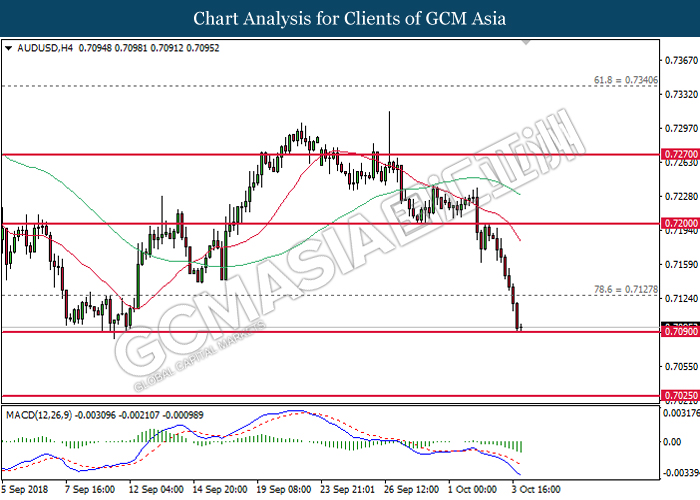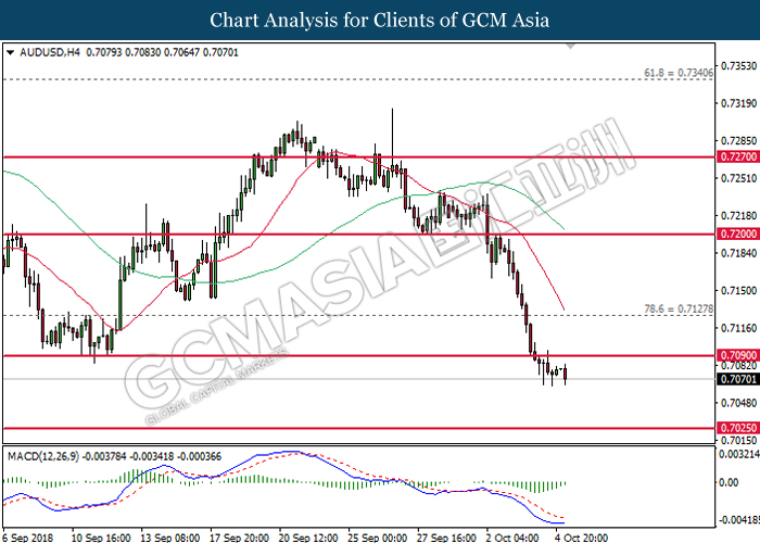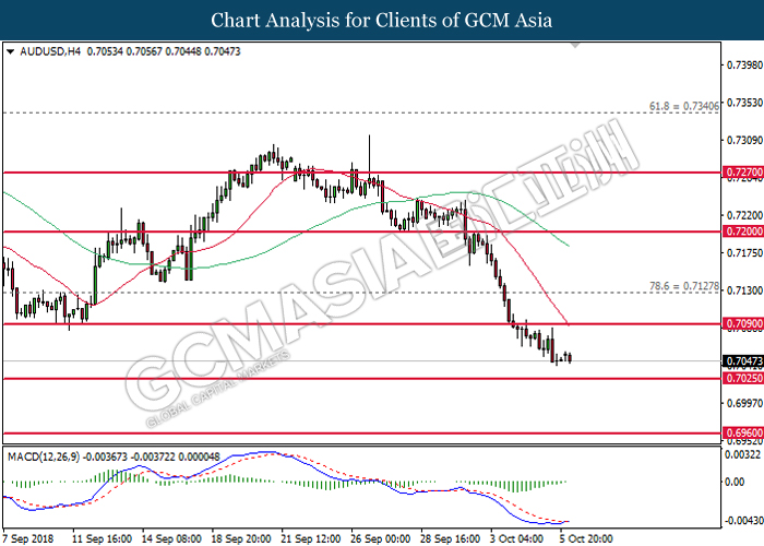 AUDUSD, H4: AUDUSD was traded in a downtrend following prior breakout from the support level of 0.7200. MACD which continues to illustrate bearish signal suggests the pair to extend its losses, towards the direction of 0.7025.