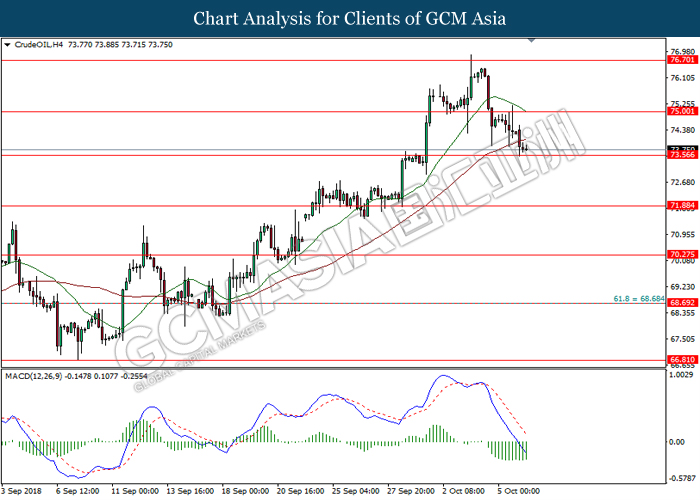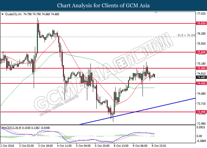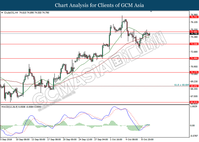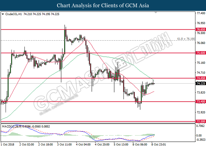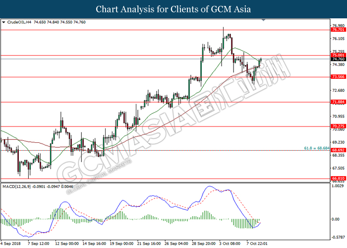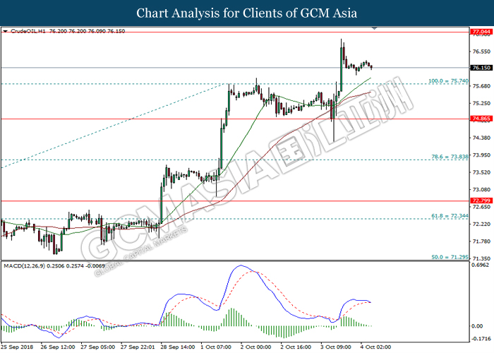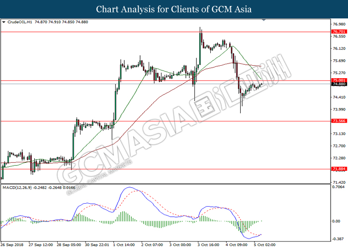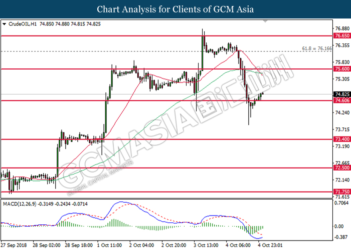 CrudeOIL, H1: Crude oil price was traded higher following prior rebound from the support level at 74.60. MACD which shows diminishing downward momentum suggests the commodity price to extend its gains, towards the direction of 75.60.