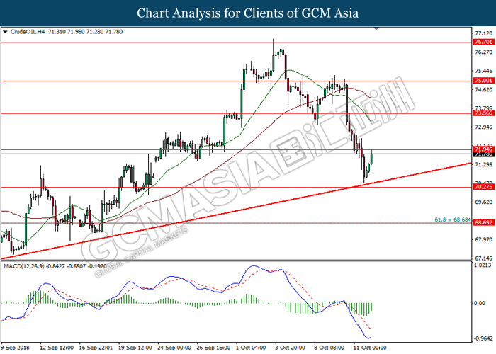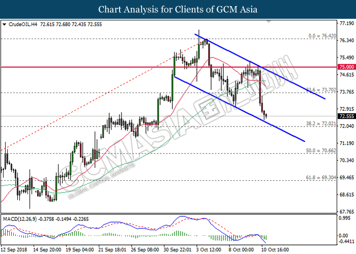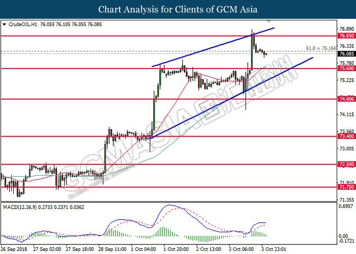 CrudeOIL, H1: Crude oil price remains traded within an ascending channel following prior retracement from the top level. MACD histogram which illustrate diminishing upward momentum suggests the commodity price to be traded lower in short-term as technical correction.