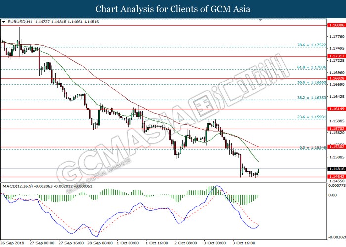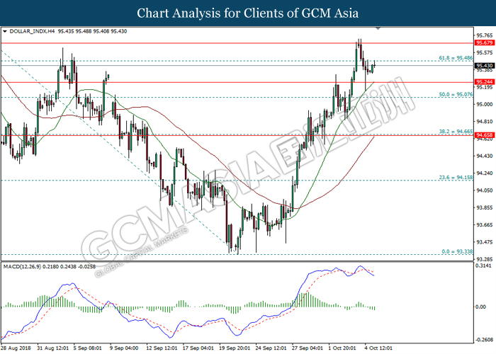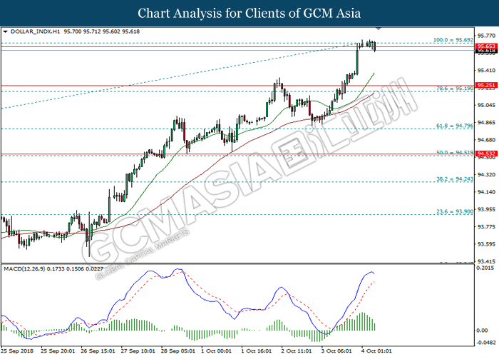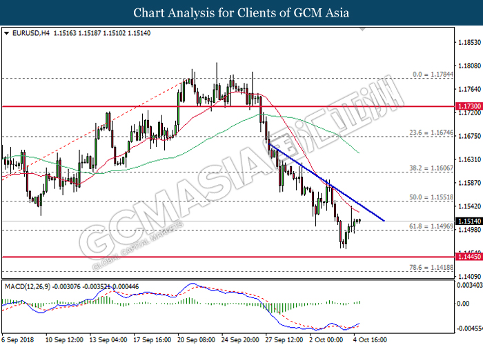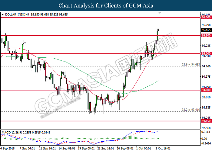 US dollar extended its rally on yesterday, touching one-month high against its peers over the backdrop of optimistic private sectors jobs data. The dollar index was quoted up 0.30%, last seen around 95.65 during Asian session. According to ADP, US private sector payrolls surged to 230,000 jobs for the month of September, its highest level since February this year. In addition, Institute of Supply Management reported that US Non-Manufacturing PMI for the month of September expanded to 61.6 versus forecast of 58.1. The data which shows positive growth on non-manufacturing sectors encompasses majority of US economy growth. On the other hand, pair of EUR/USD appreciates by 0.02% to 1.1480. The currency received some bullish support after Italy’s government announced to reduce its budget deficit for next coming years.