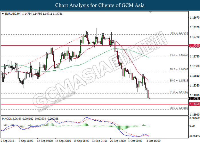 EURUSD, H4: EURUSD was traded lower following prior breakout from the support level of 1.1495. MACD which has formed a death cross signal suggests the pair to extend its losses towards the direction of 1.1445.