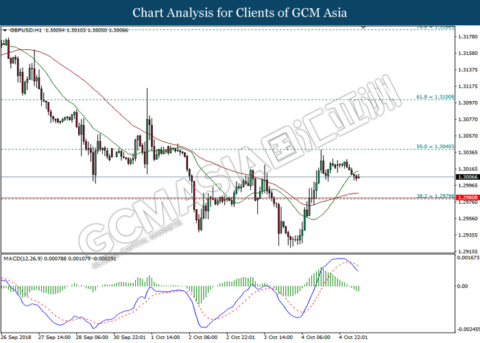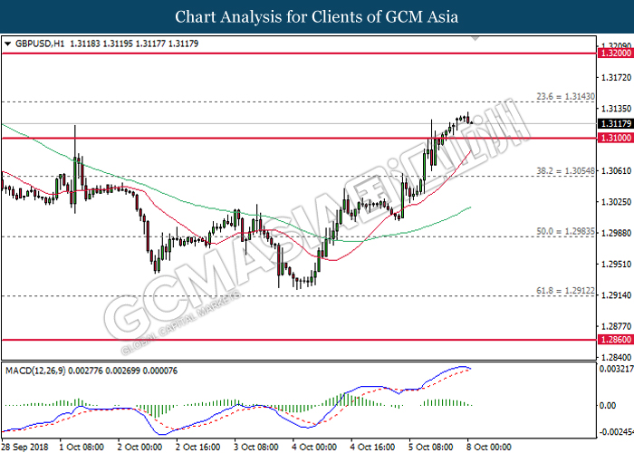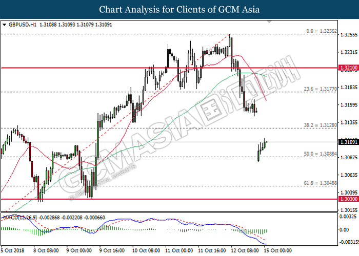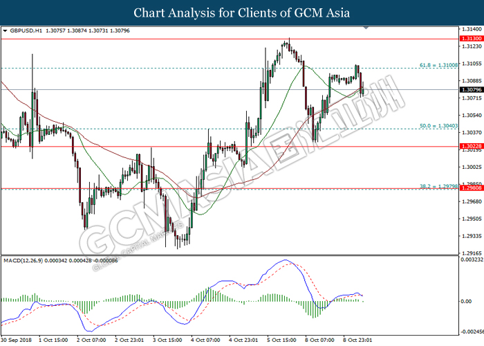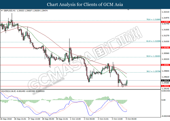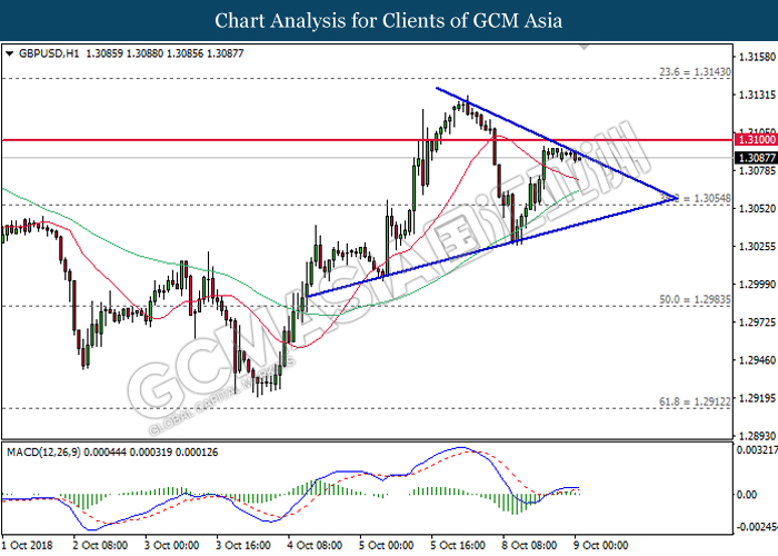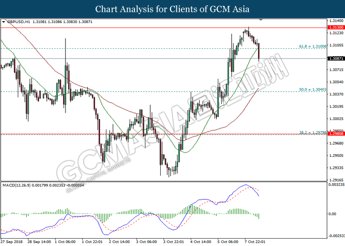 GBPUSD, H1: GBPUSD was traded higher following prior rebound from the support level of 1.3090. MACD which illustrate diminishing downward momentum suggests the pair to be traded higher in short-term as technical correction.