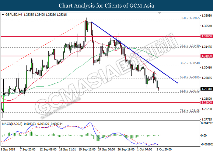 GBPUSD, H4: GBPUSD remains in a downtrend following prior retrace from the 20-MA line (red). MACD which formed death cross signal suggests the pair to extend its losses after breaking the target near 1.2910.