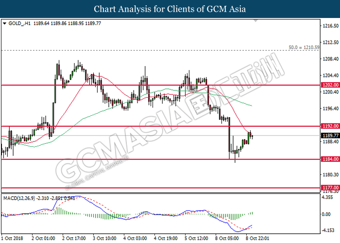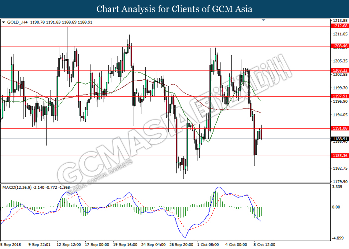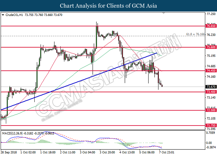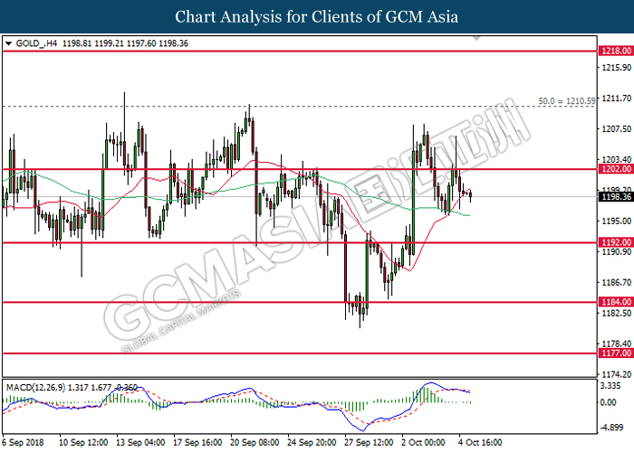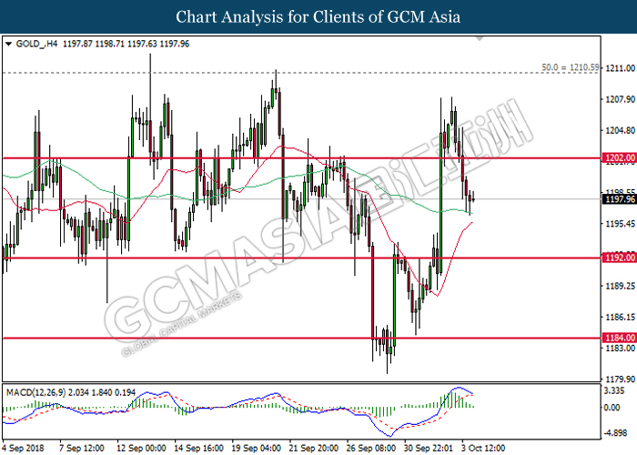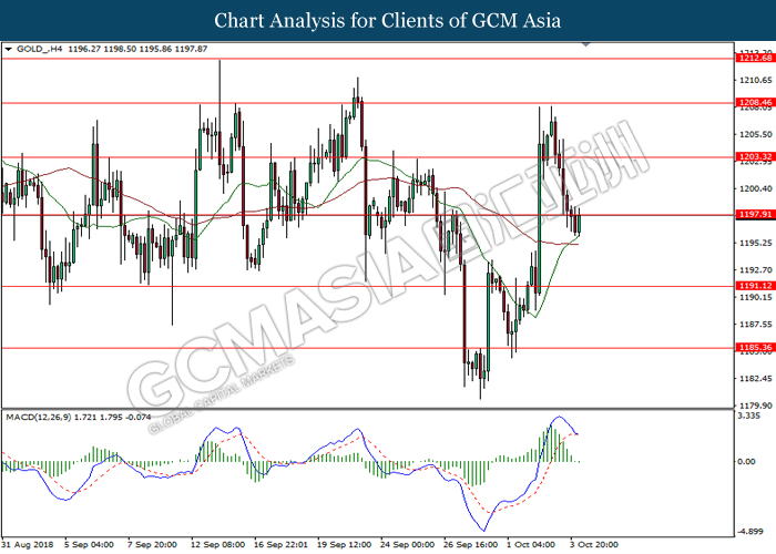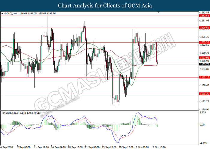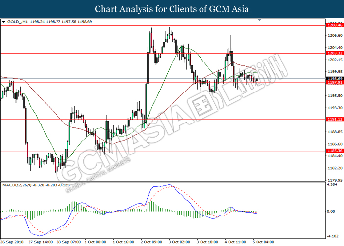 In the commodities market, crude oil price recovered some losses this morning by 0.15% to $75.00 per barrel. The commodity slumped more than 3% on yesterday after Saudi Arabia and Russia quietly agreed to increase their output in order to overcome shortage due to Iranian sanction. Otherwise, gold price slumped 0.12% to $1,198.37 a troy ounce while investors places their attention upon tonight’s highly anticipated release of Nonfarm Payrolls report.