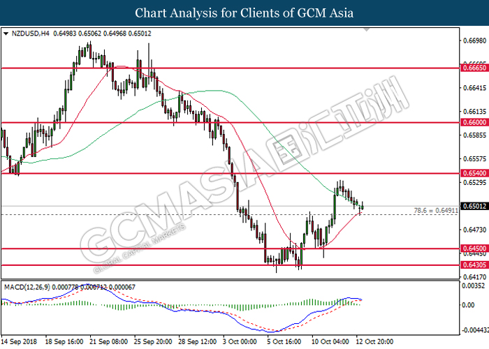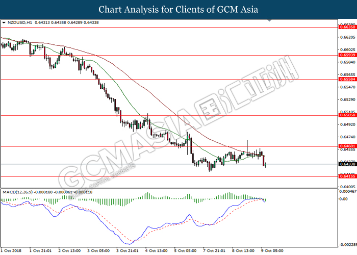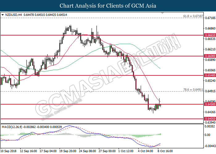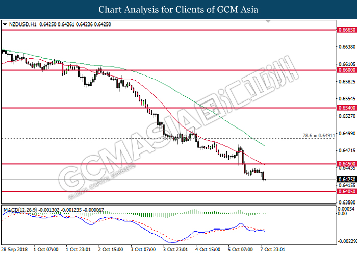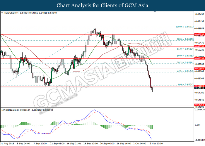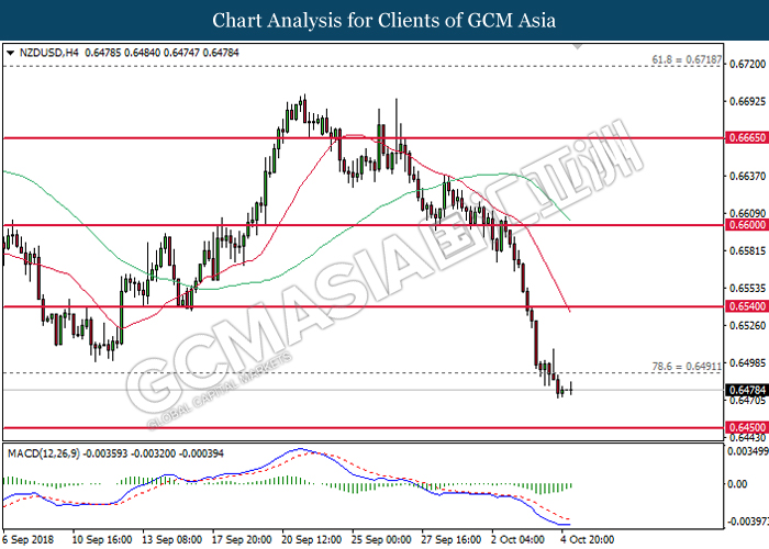 NZDUSD, H4: NZDUSD was traded lower following prior retracement from the resistance level near 0.6540. MACD which begins to form death cross signal suggests the pair to extend its losses after breaking the threshold of 0.6490.