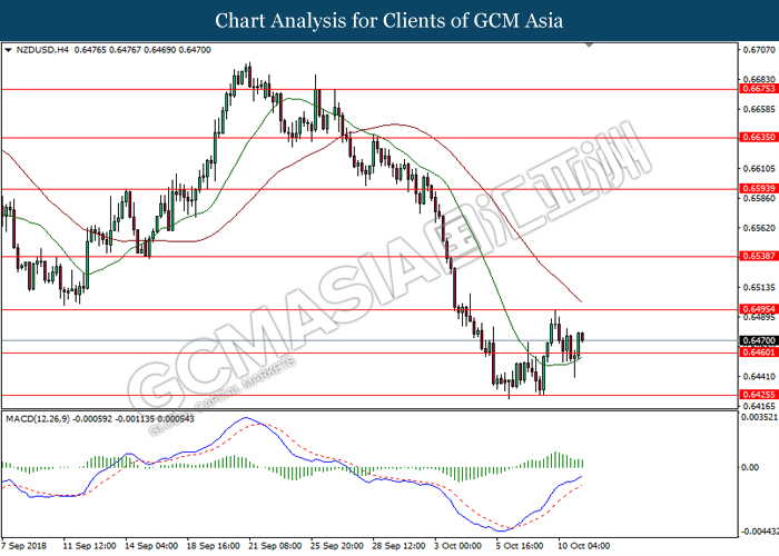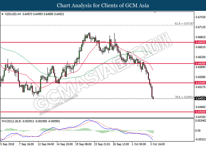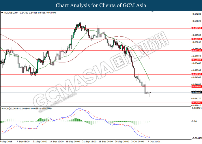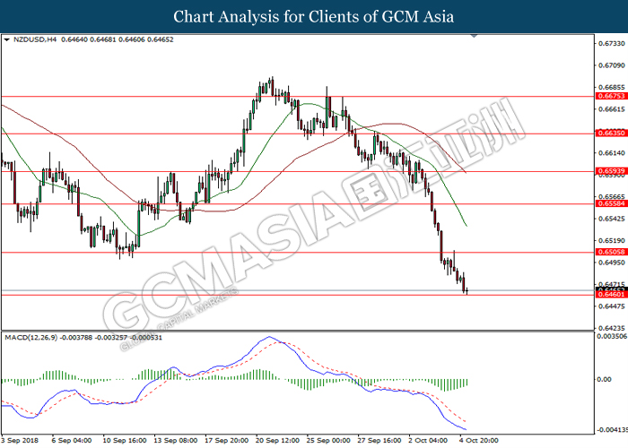 NZDUSD, H4: NZDUSD was traded lower following prior breakout from the support level at 0.6540. Overall, MACD which continues to illustrate bearish signal may suggests the pair to extend its losses, towards the direction of 0.6450.