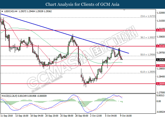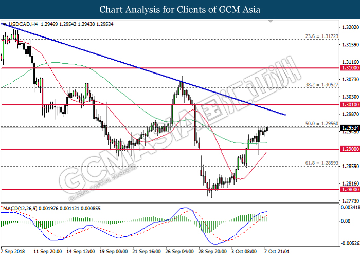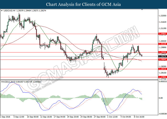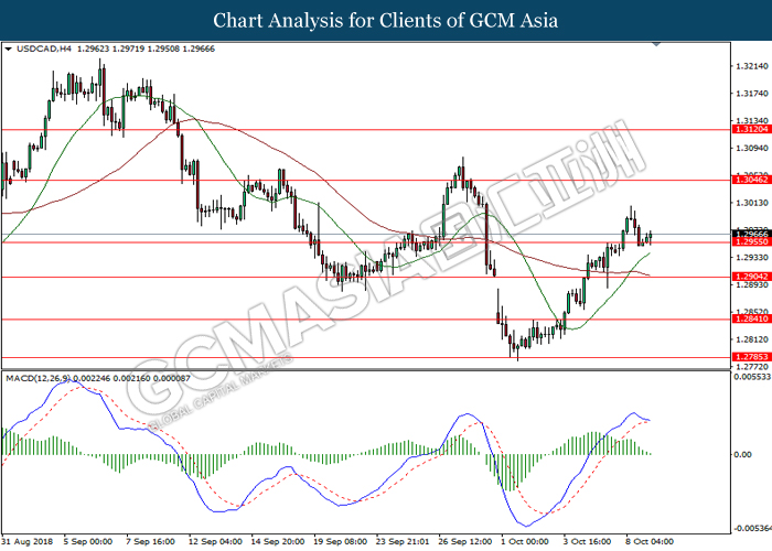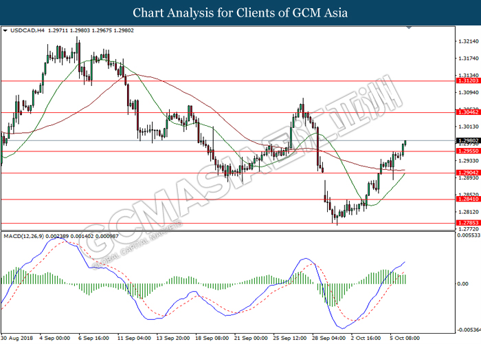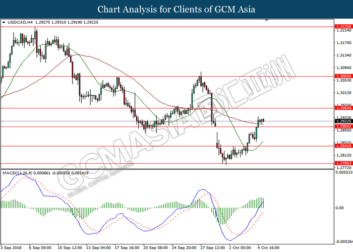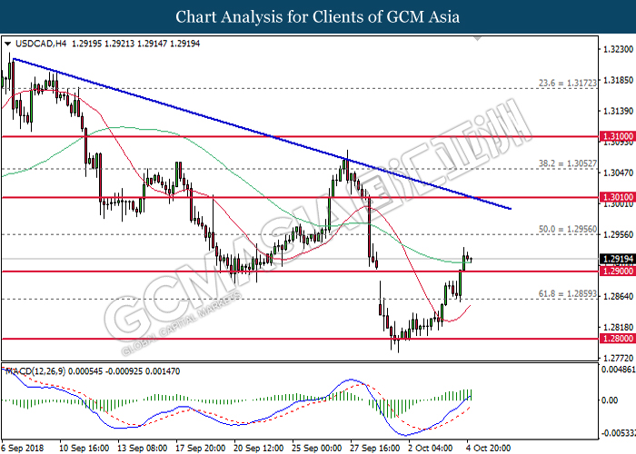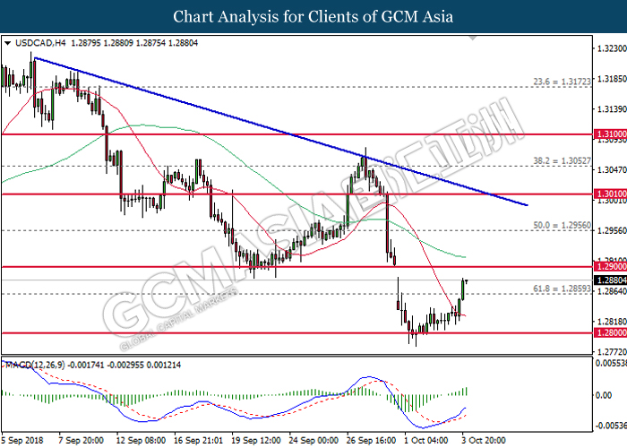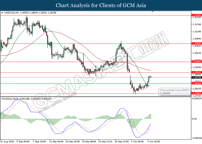 USDCAD, H4: USDCAD was traded higher following prior rebound from the threshold of 1.2800. MACD which has formed a golden cross signal suggests the pair to extend its gains after closing above the target of 1.2900.