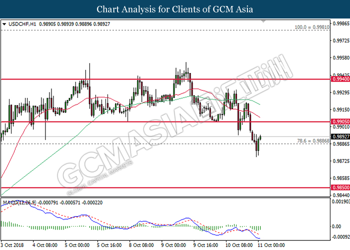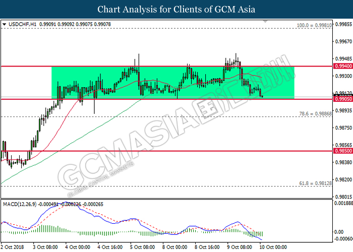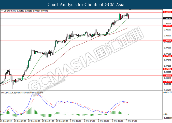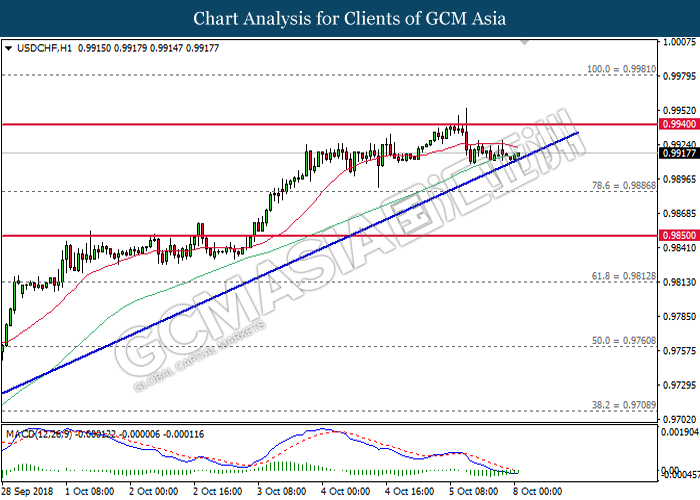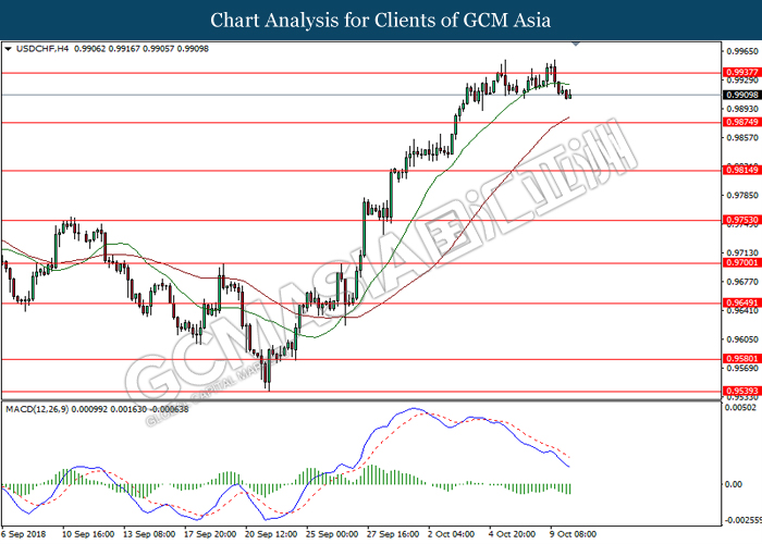 USDCHF, H1: USDCHF was traded lower following prior retracement from the resistance level 0.9930. MACD which illustrate bearish signal and the formation of death cross suggest the pair to extend its losses towards the support level 0.9875.
