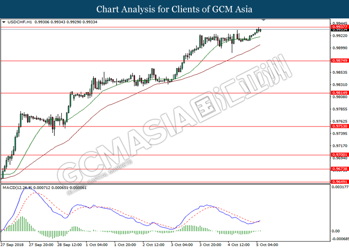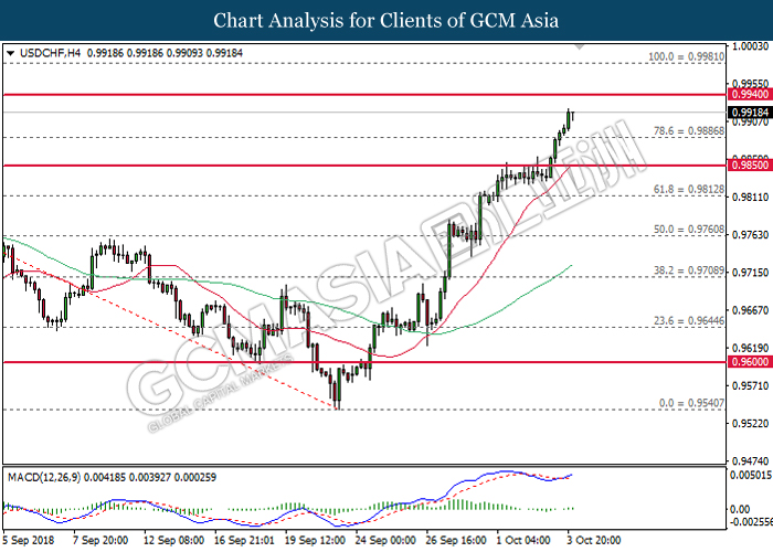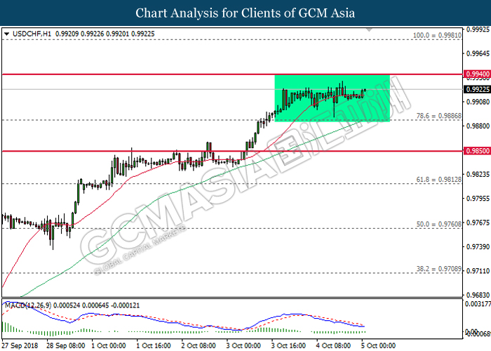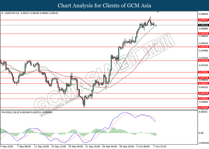 USDCHF, H4: USDCHF was traded higher following prior breakout from 0.9850. MACD which has formed a bullish signal suggests the pair to advance further up, towards the direction at 0.9940.