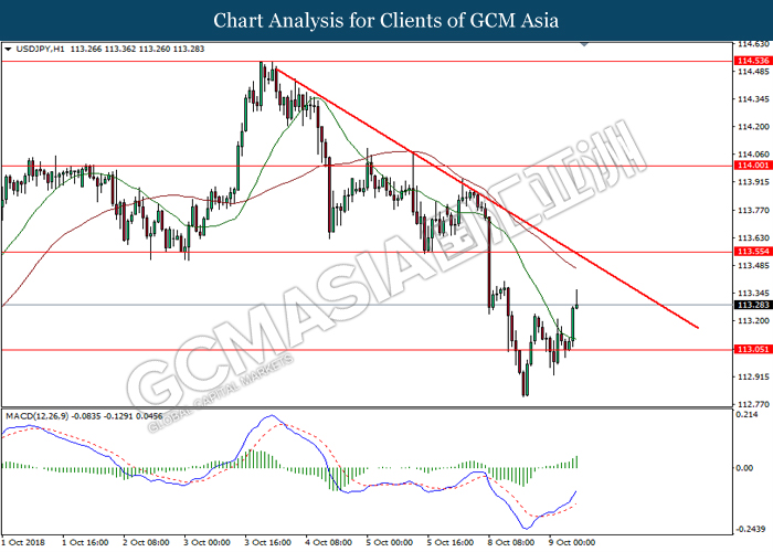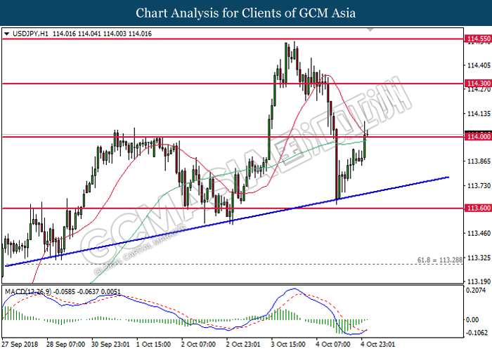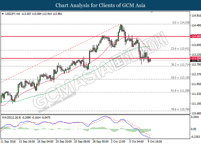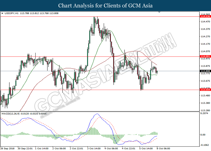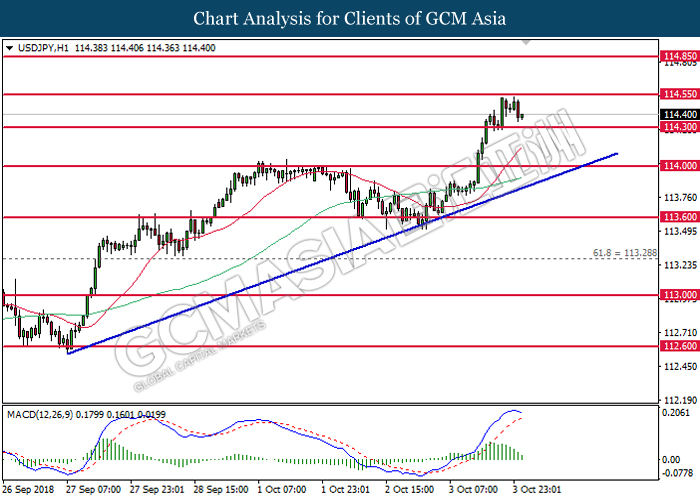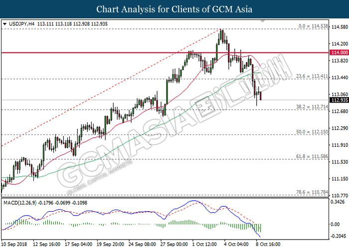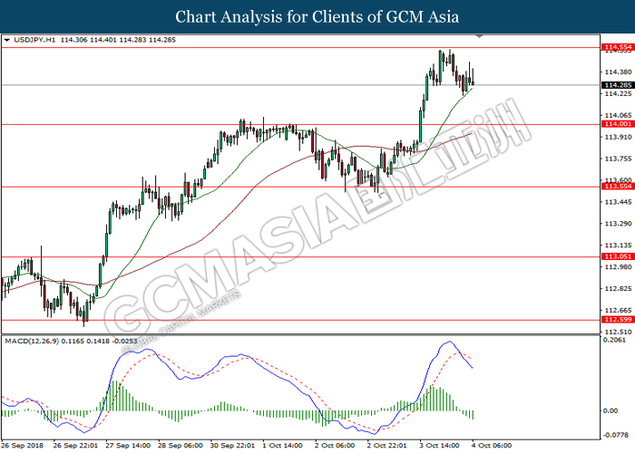 USDJPY, H1: USDJPY was traded lower following prior retrace from the target near 114.55. MACD which illustrate diminishing bullish momentum suggests the pair to be traded lower in short-term as technical correction.