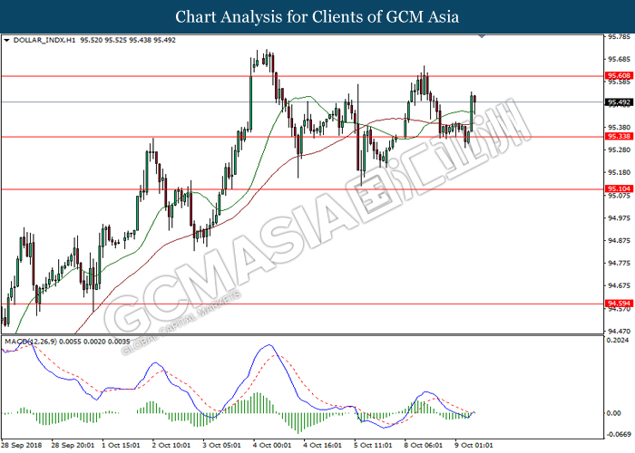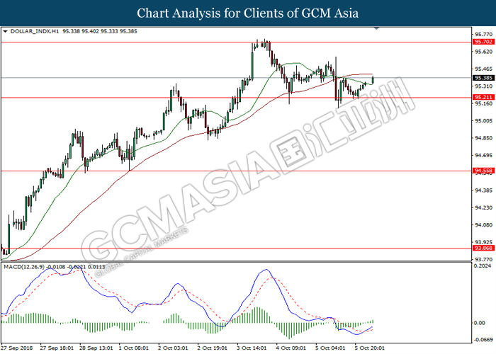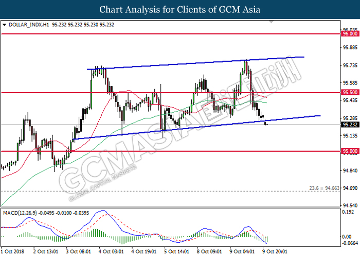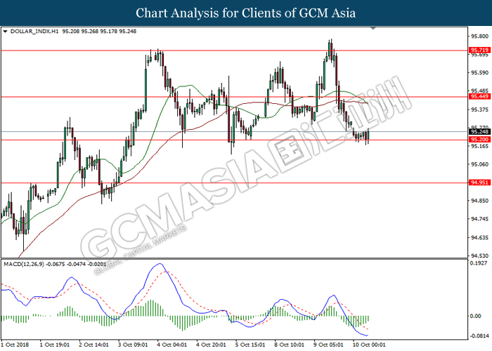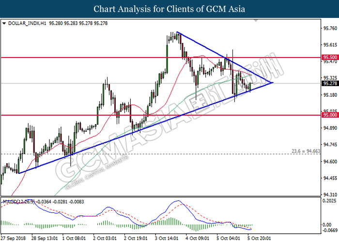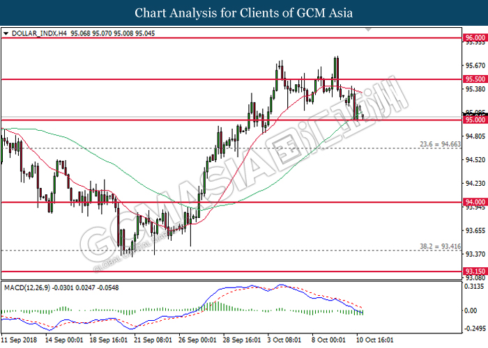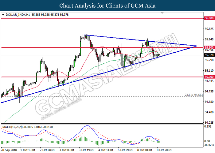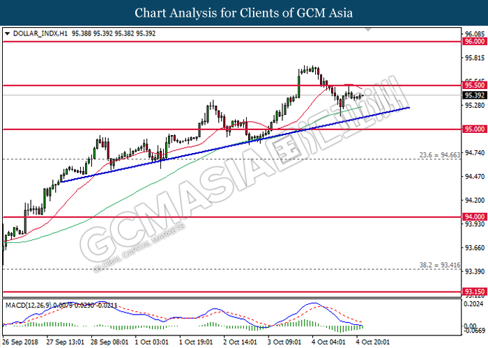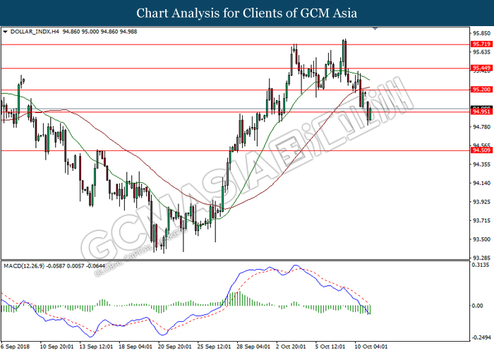 DOLLAR_INDX, H1: Dollar index was traded lower following prior retracement from the resistance level at 95.50. MACD which illustrate bearish signal suggests the index to experience technical correction and extend its retracement in short-term.