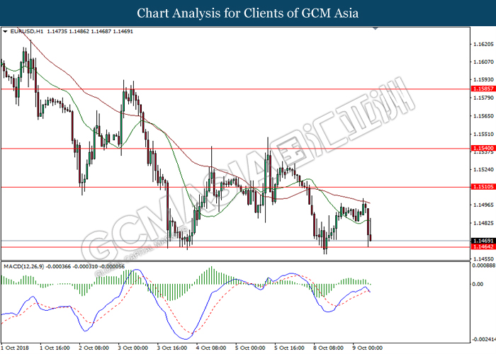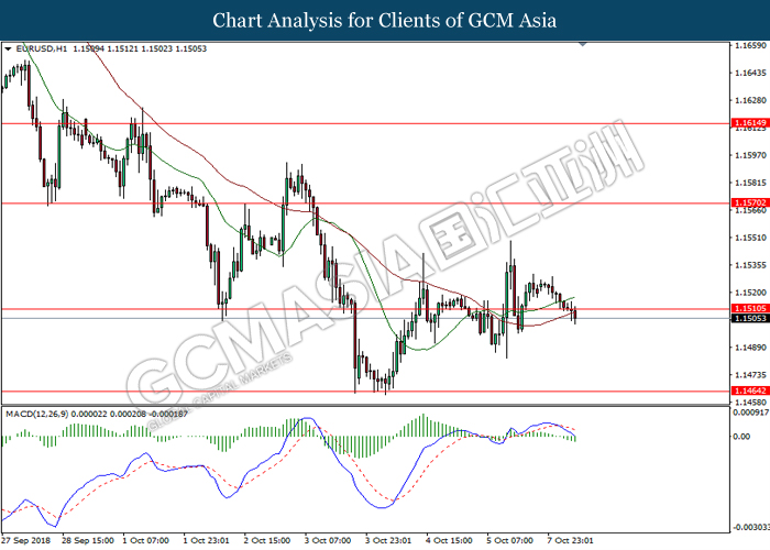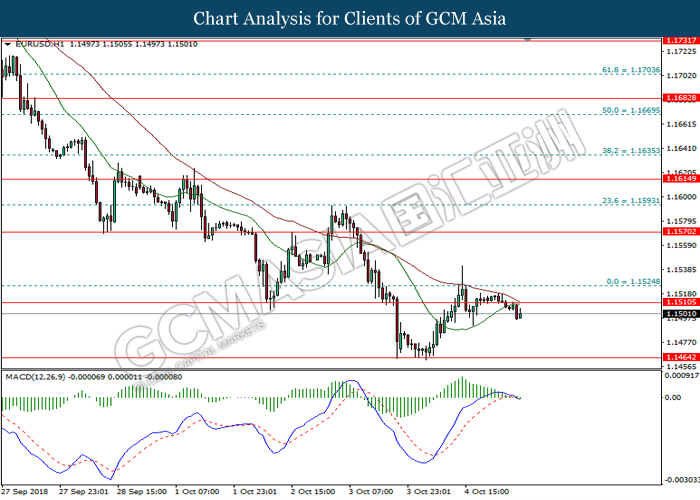 EURUSD, H1: EURUSD was traded lower following prior breakout below the previous support level 1.1510. MACD which illustrate bearish momentum and the formation of death cross suggest the pair to extend its losses towards the support level 1.1465.