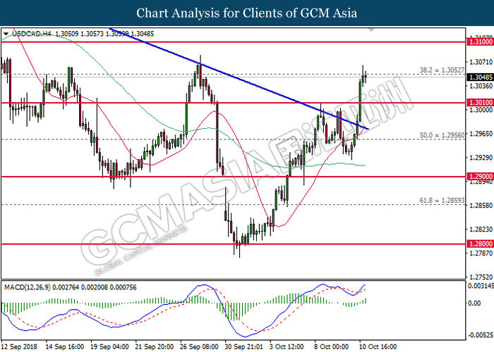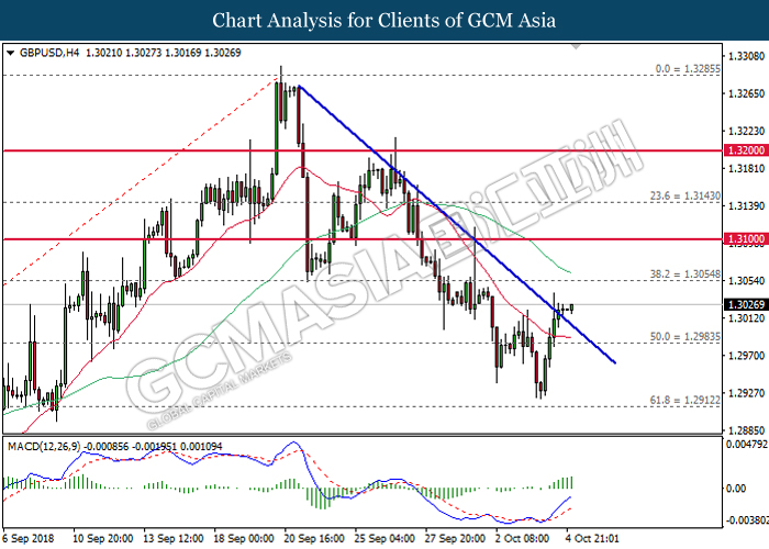GBPUSD, H4: GBPUSD was traded higher following prior breakout from the downward trendline. MACD histogram which illustrate bullish signal suggests the pair to extend its gains, towards the direction of 1.3055.