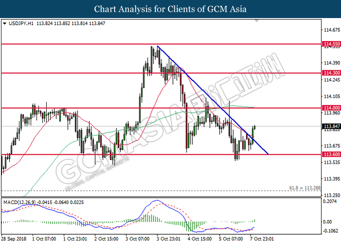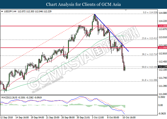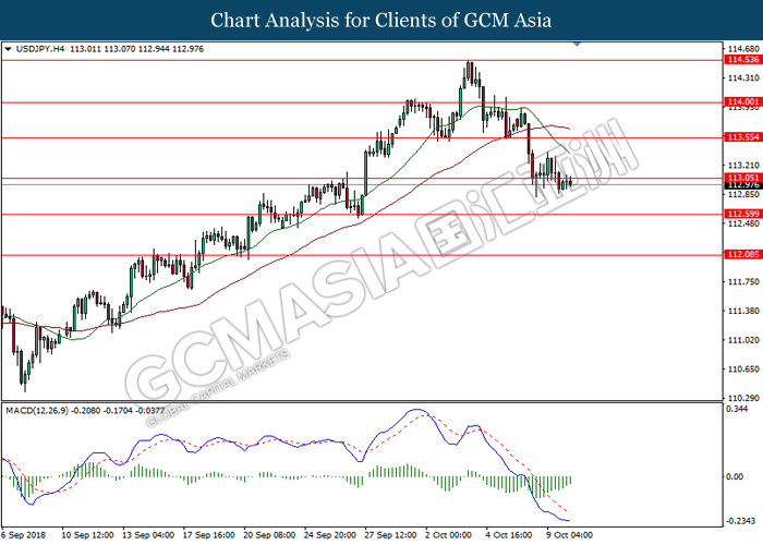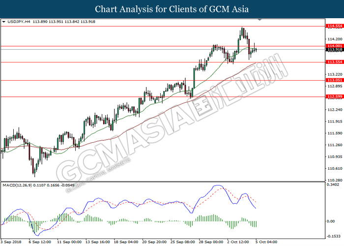 USDJPY, H4: USDJPY was traded lower following prior breakout below the previous support level 114.00. MACD which illustrate bearish momentum suggest the pair to extend its losses towards the support level 113.55.