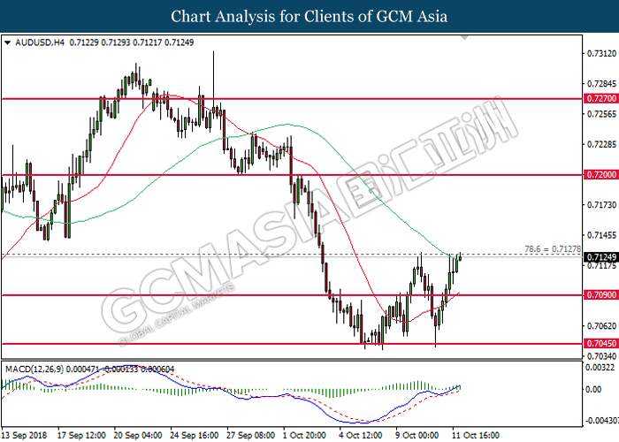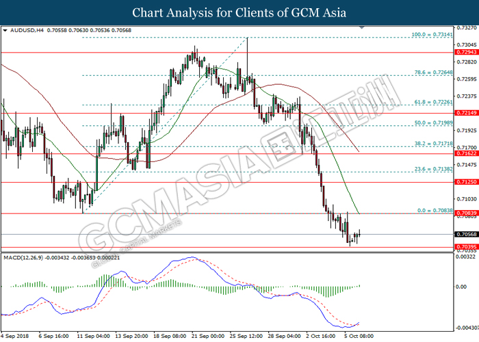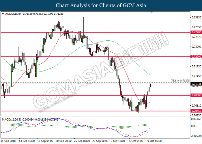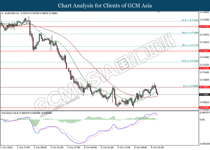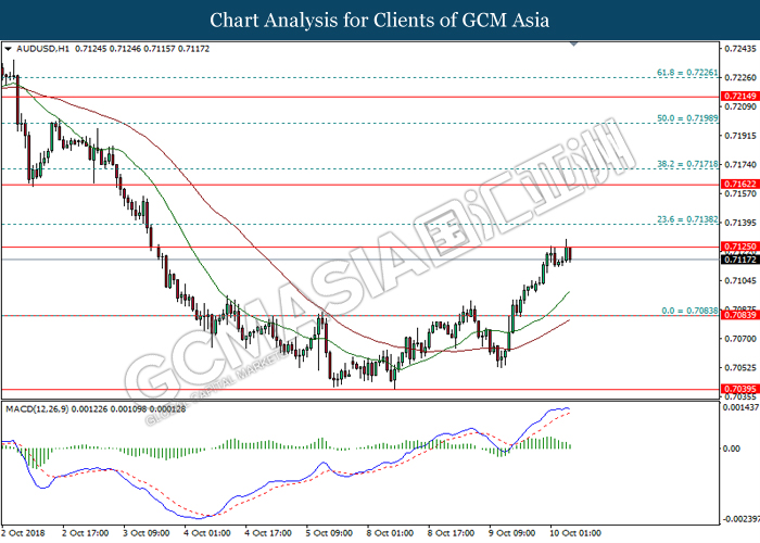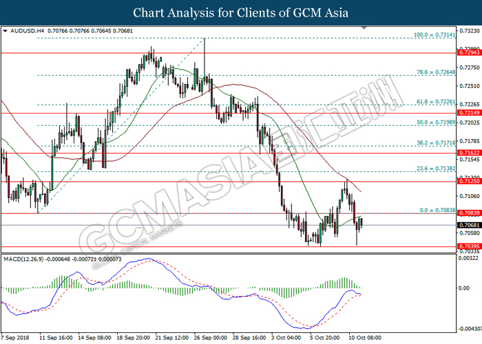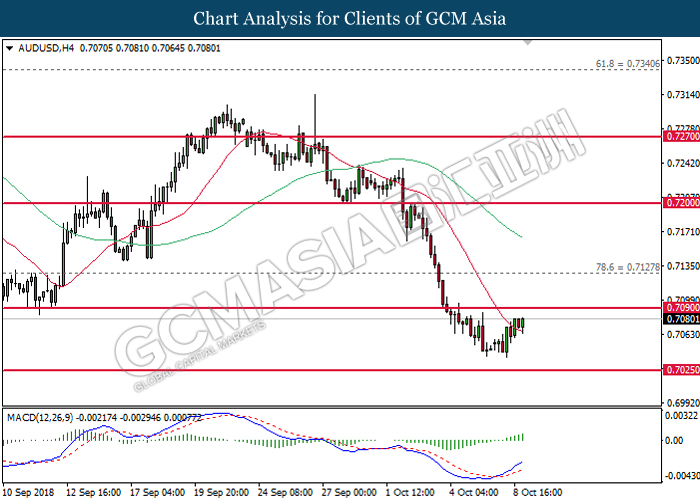 AUDUSD, H1: AUDUSD was traded higher following prior rebound from the support level 0.7085. MACD which display diminishing bearish momentum suggest the pair to be traded higher towards the resistance level 0.7125.