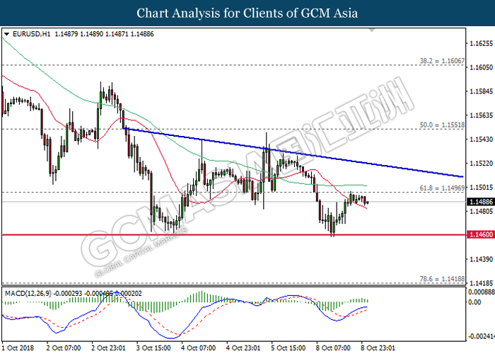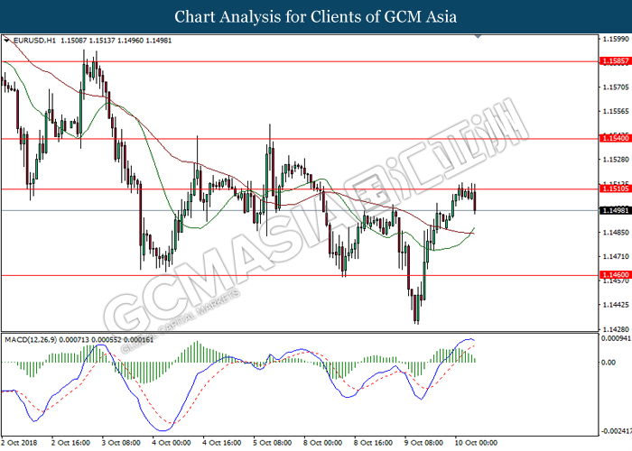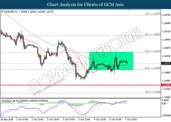 EURUSD, H1: EURUSD was traded higher following prior rebound from the support level 1.1465. MACD which display a starting bullish momentum suggest the pair to extend its rebound towards the resistance level 1.1530.