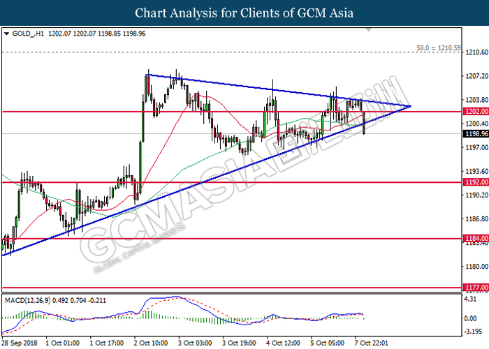 GOLD_, H1: Gold price was traded lower while currently testing the support level 1197.90. MACD which display bearish bias suggest the commodity to extend its losses after a breakout below the support level 1197.90.