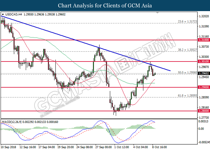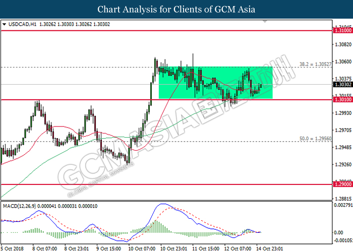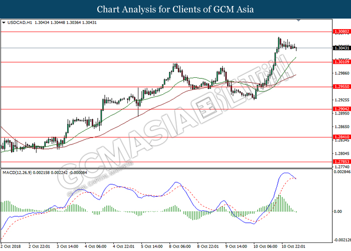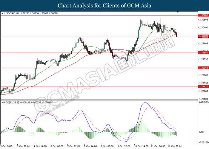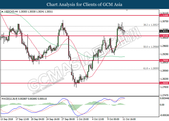 USDCAD, H1: USDCAD was traded lower while currently testing the support level 1.3010. MACD which illustrate persistent bearish signal suggest the pair to extend its losses after a breakout below the support level.