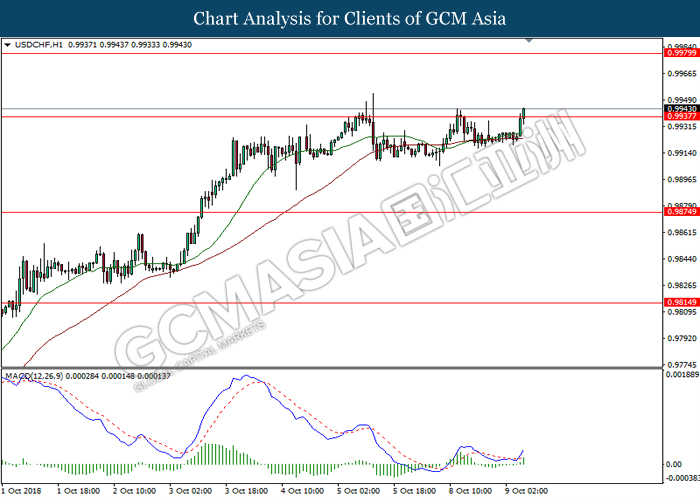 USDCHF, H1: USDCHF was traded higher while currently testing the resistance level 0.9940. MACD which illustrate bullish momentum and the formation of a golden cross suggest the pair to extend its gains after a breakout above the resistance level.