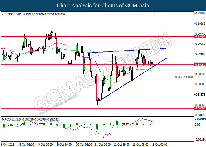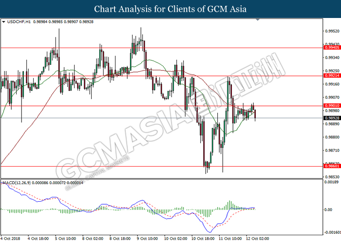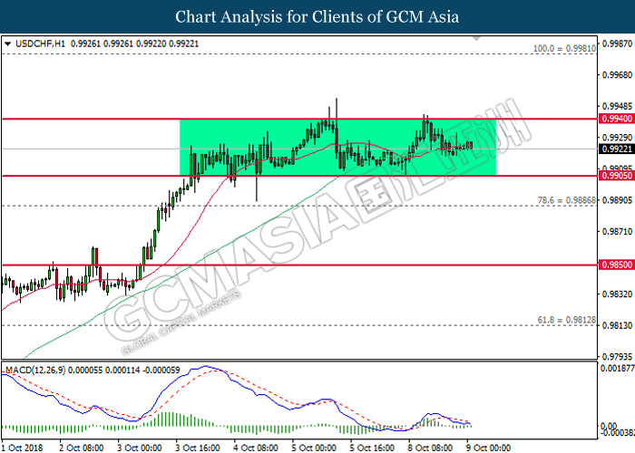 USDCHF, H1: USDCHF remains traded within a sideways channel while currently testing at the top level. Due to the lack of signal from MACD and recent price action, it is suggested to wait for a breakout from either side before entering the market.