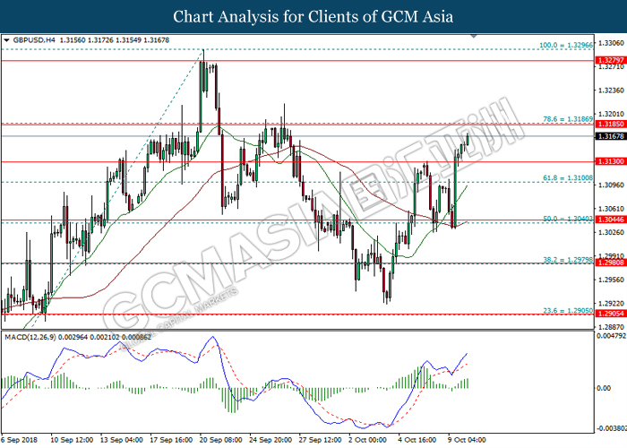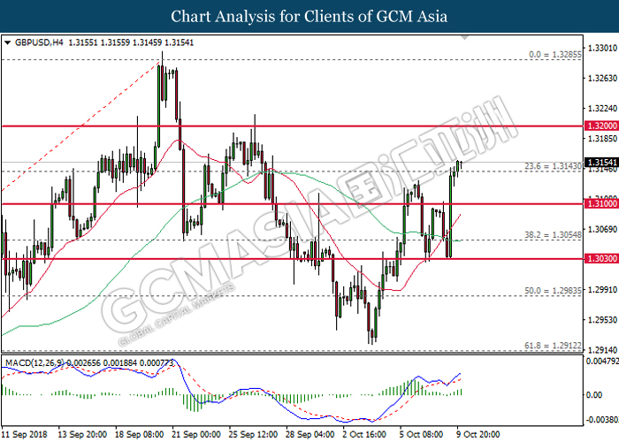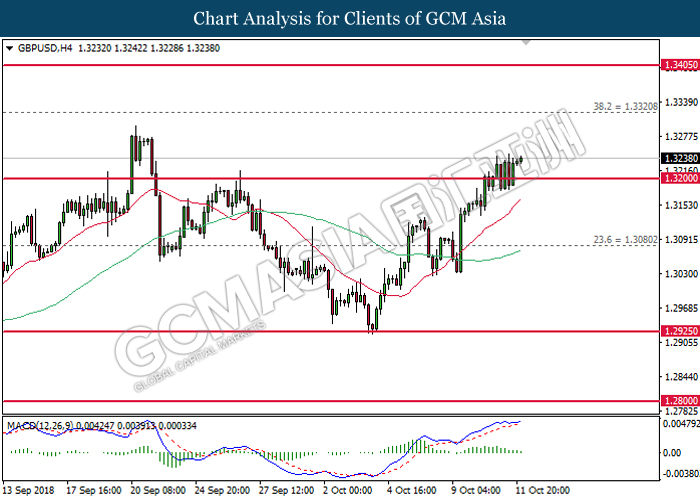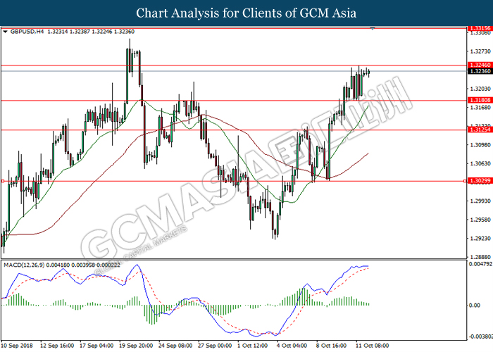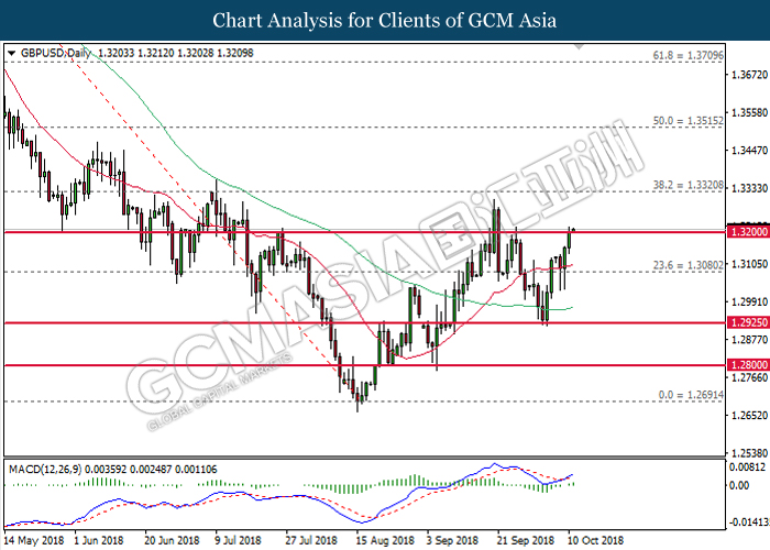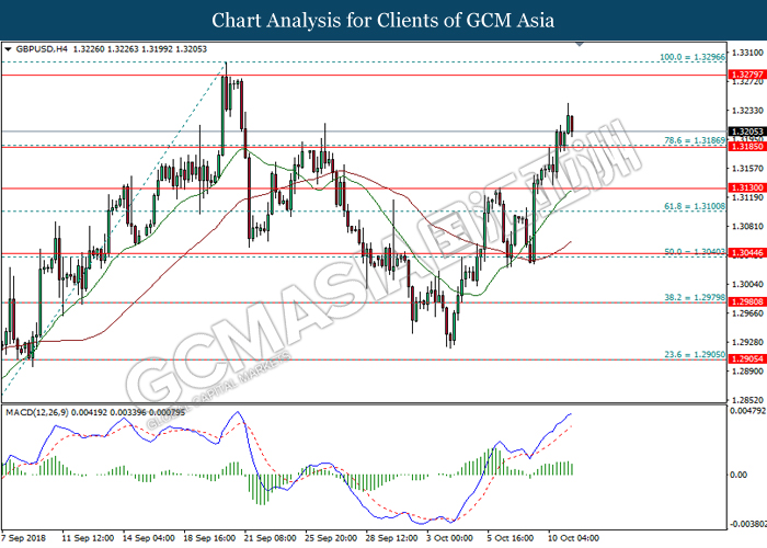GBPUSD, H4: GBPUSD was traded higher following prior breakout from the resistance of 1.3200. MACD which continues to illustrate bullish signal suggests the pair to extend its gains, towards the direction of 1.3220.