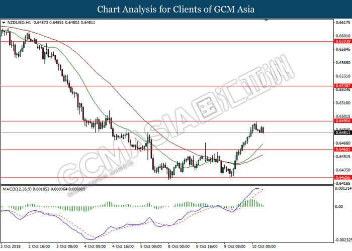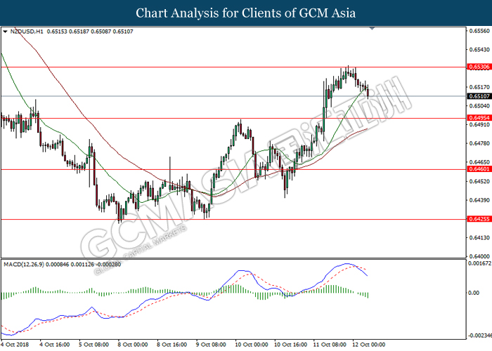 NZDUSD, H1: NZDUSD was traded lower following prior retracement from the resistance level 0.6530. MACD which display bearish momentum and the formation of death cross suggest the pair to extend its losses towards the support level 0.6495.