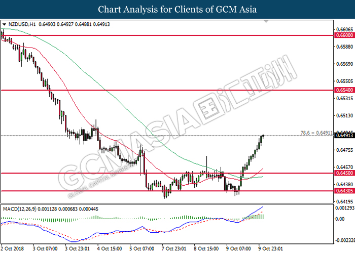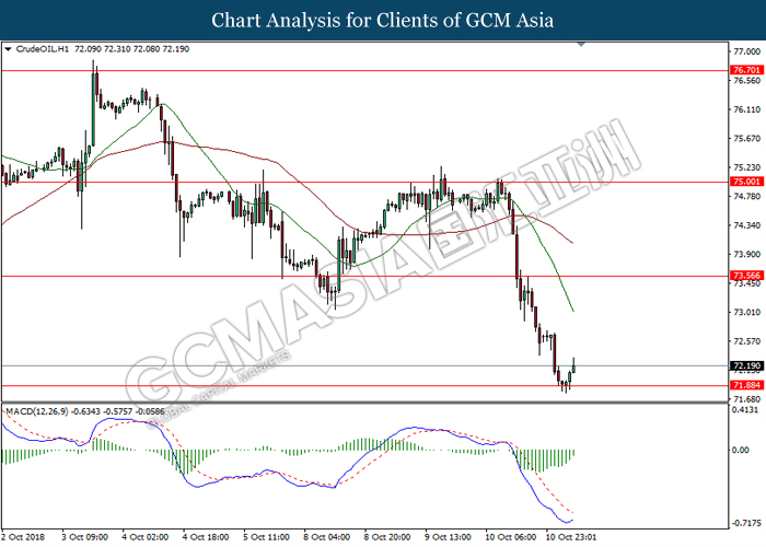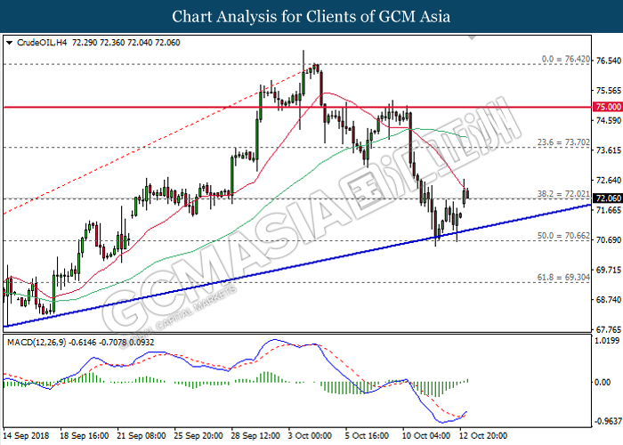 In the commodities market, crude oil price rebounds by 1.12% to $72.25 per barrel. Oil prices continued its bullish momentum since last Friday after reports shows that China’s export remained resilient albeit escalating trade war between Beijing and Washington. On the other hand, gold price rose 0.26% to $1,221.12 a troy ounce over the backdrop of escalating political and economic risk which arises from the UK over Brexit issues.
