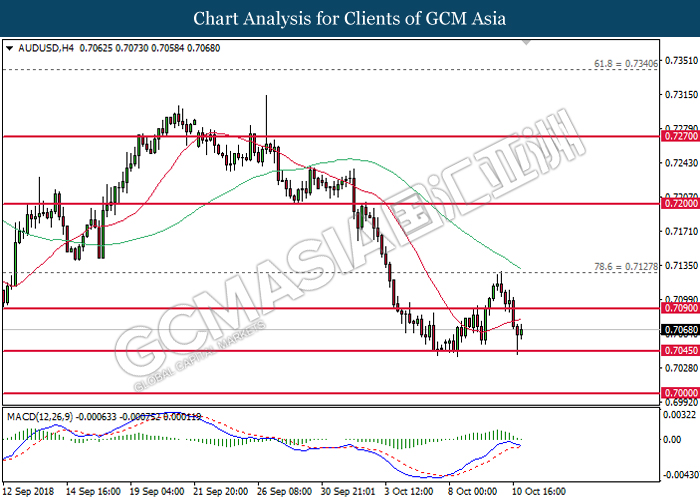 AUDUSD, H4: AUDUSD was traded lower following prior breakout below the previous support level 0.7085. MACD which illustrate persistent bearish momentum suggest the pair to extend its losses towards the support level 0.7040.