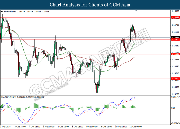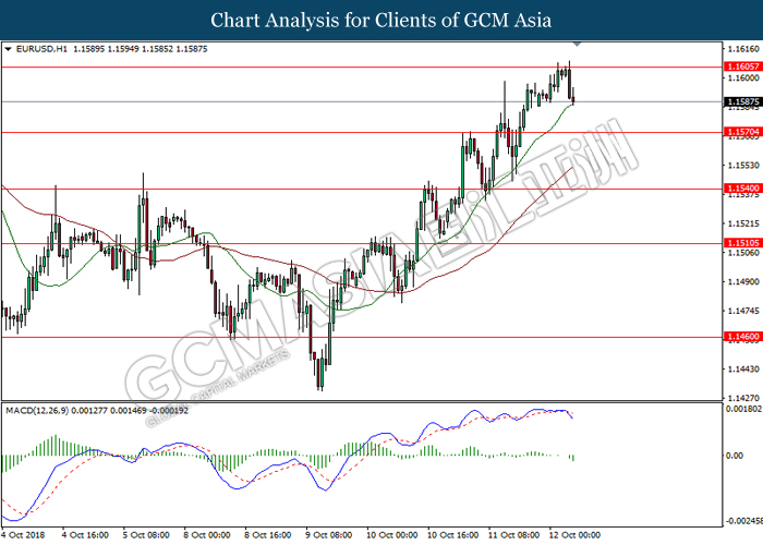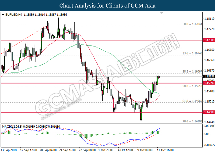 EURUSD, H4: EURUSD was traded higher following prior breakout from the resistance of 1.1570. MACD which illustrate bullish signal suggests the pair to extend its gains after closing above the resistance level at 1.1605.