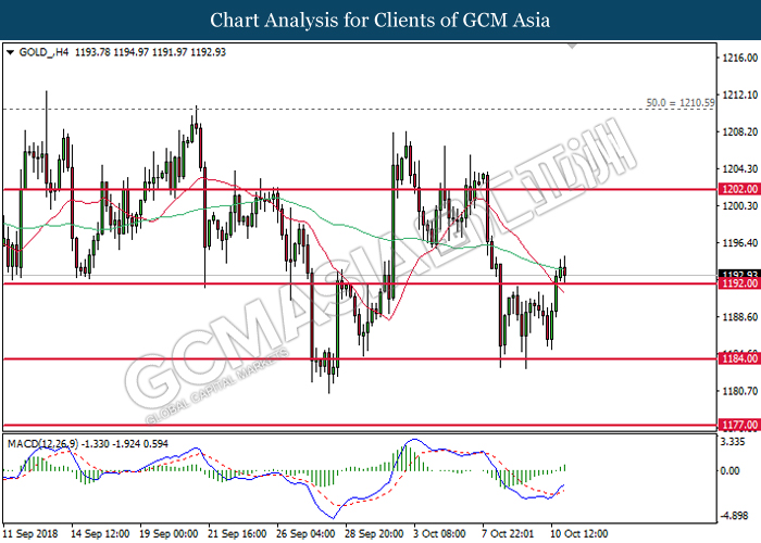 GOLD_, H4: Gold price was traded lower following prior retracement from the resistance at 1202.00. MACD which begins to form a death cross signal suggests the commodity price to be traded lower in short-term, towards the 60-MA line (green).