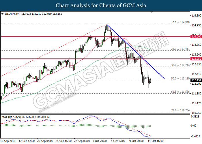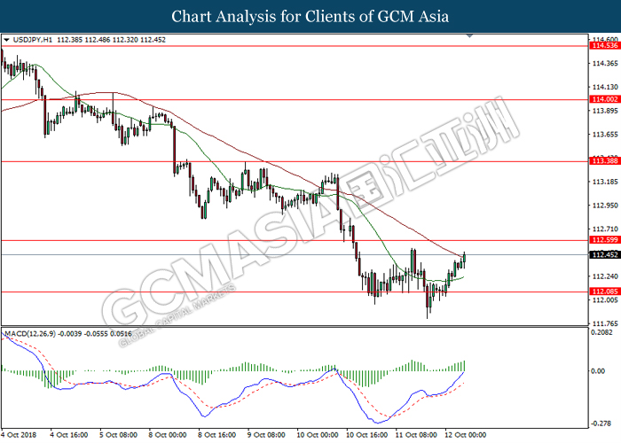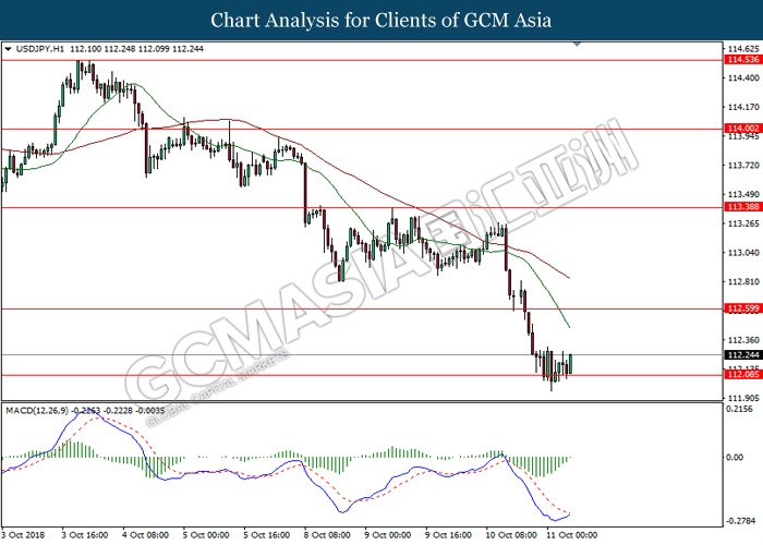 USDJPY, H1: USDJPY was traded higher following prior rebound from the support level 112.10. MACD which display persistent bullish momentum suggest the pair to extend its rebound towards the resistance level 112.60.