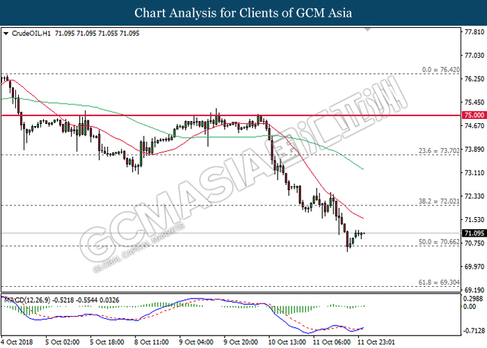 In the commodities market, crude oil price recovered its losses by 0.13% to $71.00 per barrel during early Asian trading session. The commodity received large selloff after EIA reported that crude inventories rose higher than expected with 5.987 million barrels versus forecast of only 2.620 million barrels. Otherwise, gold price slumped by 0.28% to $1,220.91 a troy ounce this morning. However, the commodity jumped more than 3% on yesterday following tumbling stock around the globe which raises the demand for safe-haven assets due to risk aversion.