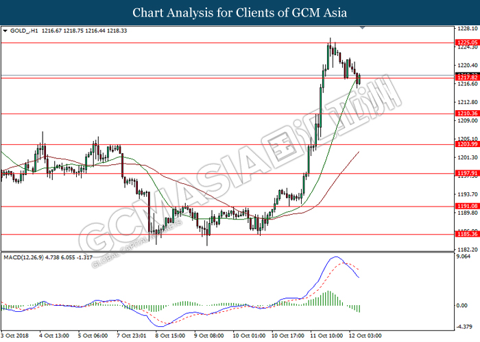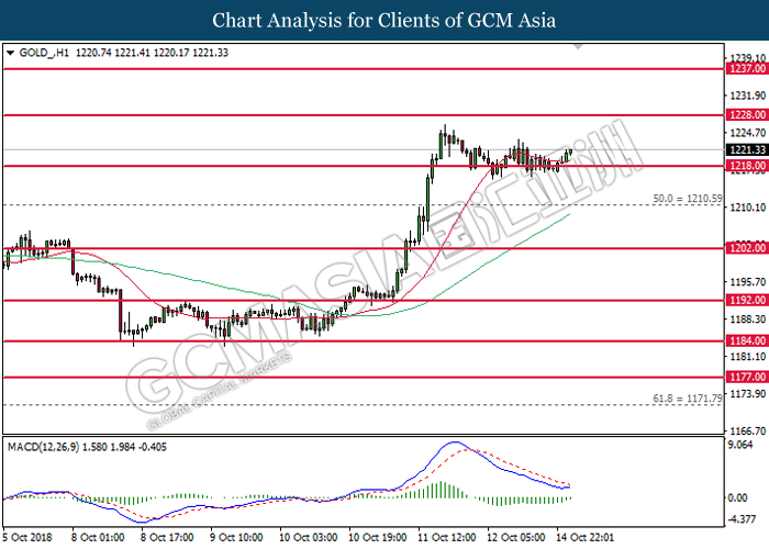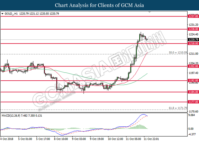 GOLD_, H1: Gold price was traded higher following prior rebound from the support level of 1218.00. MACD which illustrate diminishing downward momentum suggests the commodity price to extend its gains in short-term, towards the direction of 1228.00.