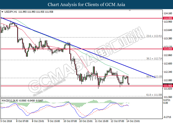 USDJPY, H1: USDJPY was traded lower following prior retracement from 20-MA line (red). MACD which begins to form a death cross signal suggests the pair to extend its losses after closing below the threshold of 111.90.