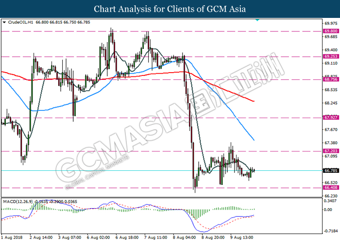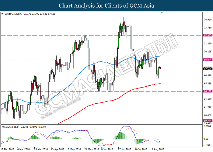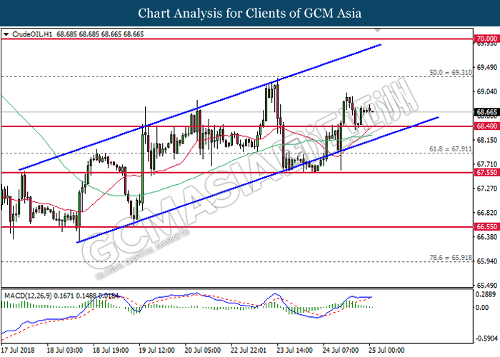 In the commodities markets, the price of crude oil gains 0.15% to $67.20 a barrel at the time of writing following with the release of OPEC Monthly Report. According to the statement in the monthly report, Saudi Arabia has reduce their productions for the month of July despite the government have promised to increase their output to compensate for expected fall of Iranian oil. However, global growth demand were expected to down 20k bpd to 1.4m bpd. Thus, investors will shift their attention towards the Crude Oil Inventories to determine further momentum for the black oil. On the other hand, the price of gold have rebound 0.15% to $1207.75 a troy ounce as of writing amid dollar strength that supported by the reports on Andrew Brunson release and also the progress of ongoing trade war between US and various countries.