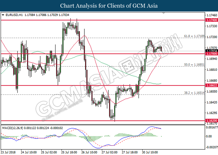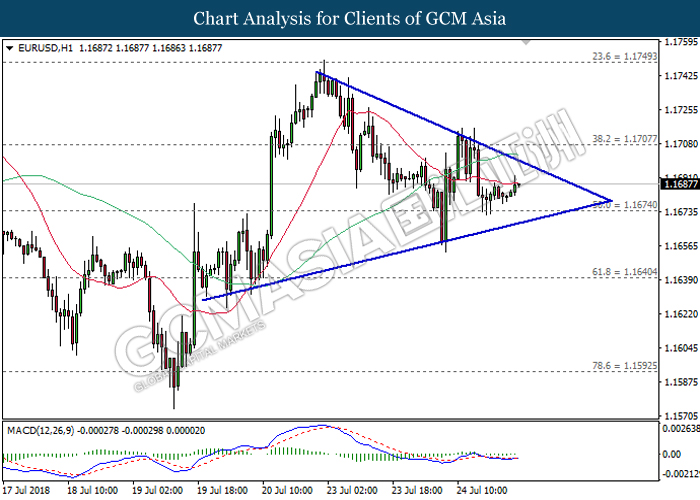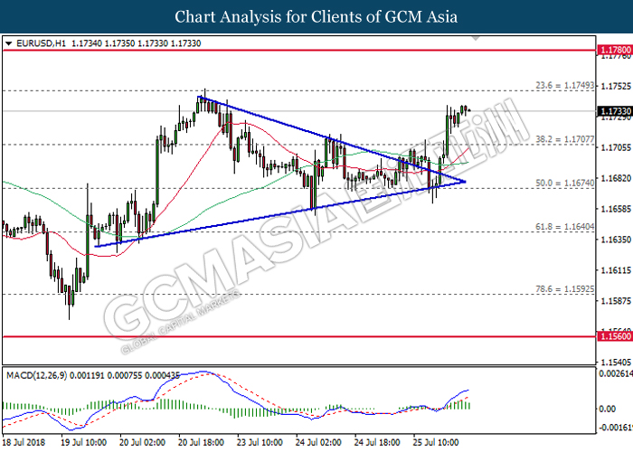 EURUSD, H1: EURUSD extended gains following prior breakout from the top level of narrowing triangle. Although MACD histogram illustrate bullish signal, a close above the resistance level near 1.1750 is required to attain further confirmation.