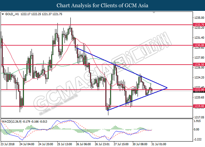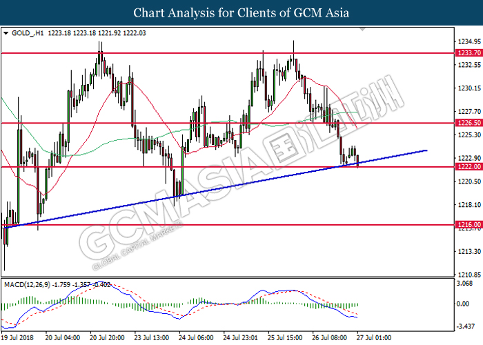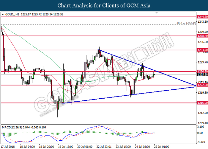 GOLD_, H1: Gold price was traded higher following prior rebound from the upward trendline. Although MACD illustrate bearish signal, close below the trendline and support of 1222.00 is required to attain further confirmation.