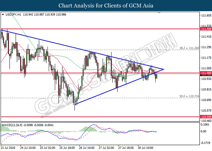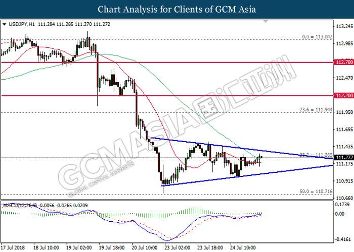 USDJPY, H1: USDJPY remains traded within a narrowing triangle while currently testing near the upper level. Although MACD has formed a bullish crossover which suggests upside signal, a break above the narrowing triangle is required to obtain further clarification.