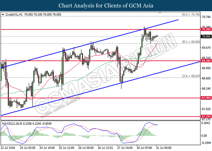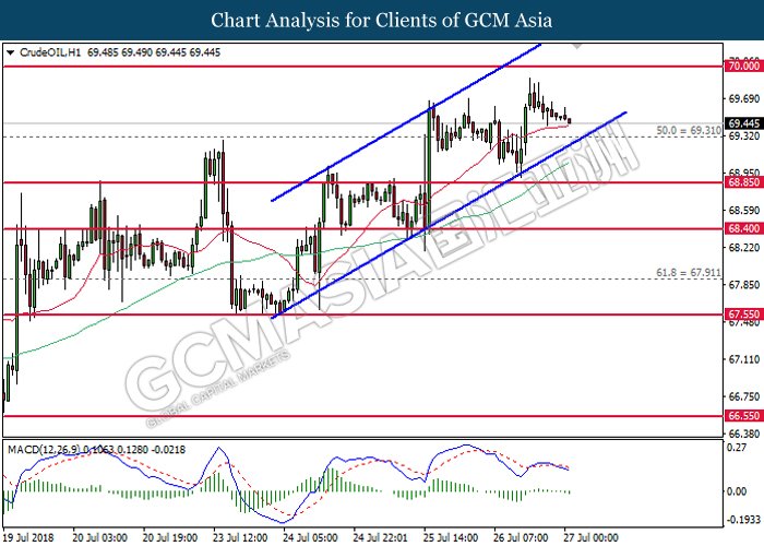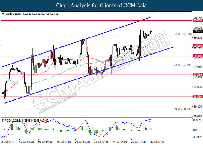 CrudeOIL, H1: Crude oil price remains traded within an ascending channel while recently rebounds from the support level of 69.30. MACD which continues to illustrate bullish signal suggests the commodity price to extend its gains, towards the direction of strong resistance level near 70.00.