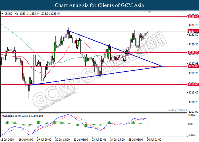 GOLD_, H1: Gold price was traded higher following prior breakout from the top level of narrowing triangle. Although both MA lines and MACD illustrate bullish bias, a break above 1233.70 is required to attain further confirmation.