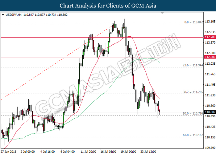 USDJPY, H4: USDJPY resumed its major downtrend following prior retracement from the 20-MA line (red). Both MA line which continues to expand downwards suggests further bearish bias. Thus, a close below the support level of 110.70 will further validate the downside signal.