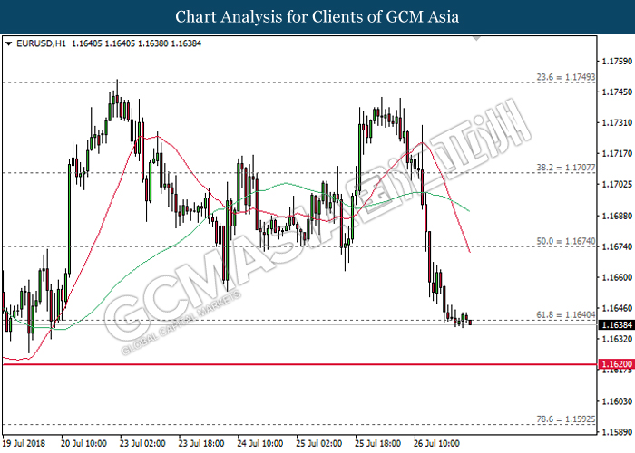 Greenback stood tall against all other major peers on Thursday following broad sell off on the Euro amid dovish stance delivered by the European Central Bank (ECB) President Mario Draghi. As of writing, dollar index was quoted up 0.45% to 94.50 while pairing of EUR/USD slumped 0.60% to $1.1638. In a highly anticipated ECB policy meeting on yesterday, Draghi postulate that it is not a necessity to “modify or add new language” into the bank’s interest rate forward guidance while reiterating to keep their rates unchanged up until summer of 2019. His seemingly dovish take on interest rate hike has delivered a severe bearish blow to the Euro as the signal suggests the ECB would be rather unlikely to hike their interest rate before October 2019. On the other hand, greenback remained resilient throughout the North American trading session despite weaker-than-expected economic data as investors place higher expectation towards their domestic economic growth for second quarter. According to US Commerce Department, Core Durable Goods Orders missed economist forecast with 0.4% versus 0.5% seen for the month of June.