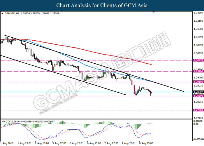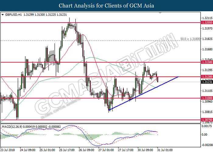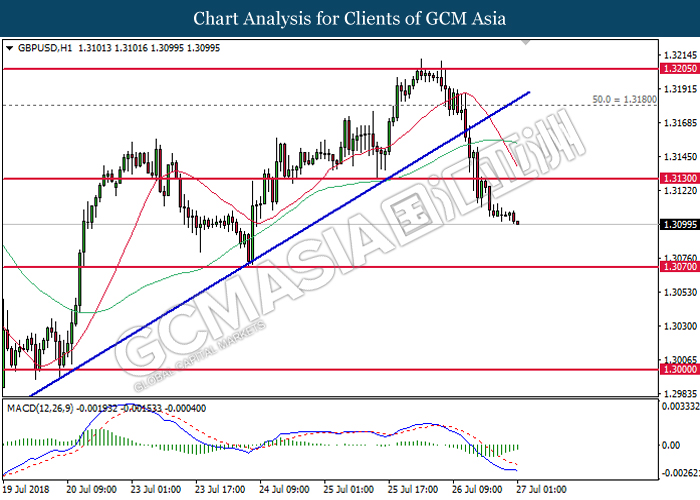 GBPUSD, H1: GBPUSD was traded lower following prior breakout from the upward trendline. Both MA line which continues to expand downward suggests the pair to extend its losses towards the direction of support level near 1.3070.
