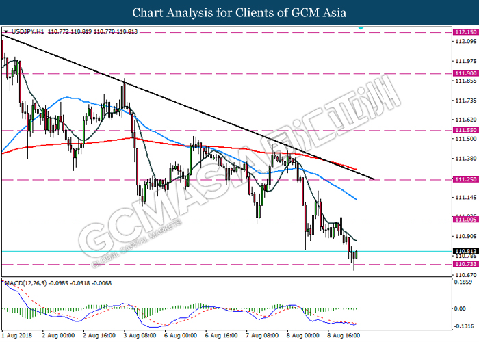 USDJPY, H1: USDJPY was traded higher while currently testing the resistance level 110.75 and descending trend line. Although MACD which display ongoing bullish momentum, a breakout above the resistance level 110.75 and trend line is required for further confirmation.