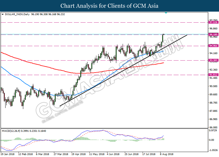 The dollar has continued its ascension and created a new high level repeatedly following most sentiments that remain subjected to the expectations of Fed rate hike and major headlines in the Turkish financial crisis. Markets remain in high expectation that the likeliness of increase in the Fed rate for September remains unchanged with a percentage rate of 90 percent. In addition, trade war between the US and China remains focused by investors where the market remains optimistic about the U.S. in the long run. The dollar index has rose 0.03% to 96.52 during writing. Meanwhile, GBPUSD has fell 0.11% to 0.7257 at the time of writing despite the steady economic data of the job market. According to the National Statistics from UK, the unemployment rate in the UK has improved with a 4.0% decrease, lower than the market expectations with a reading of 4.2%. However, it did not create a positive impact that could have lasted for the sentiment in pound sterling where additional details also revealed that the growth in annual wages was slower than expectations with 2.4% reading, weaker from expectations of 2.5%.