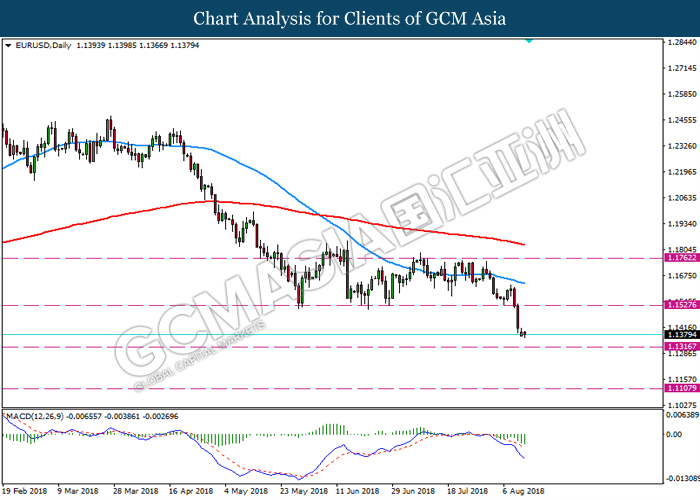 EURUSD, H1: EURUSD was traded lower while currently testing the support level 1.1325. MACD which display clear bearish bias suggest the pair may extend its losses after it breaks below the support level 1.1325.