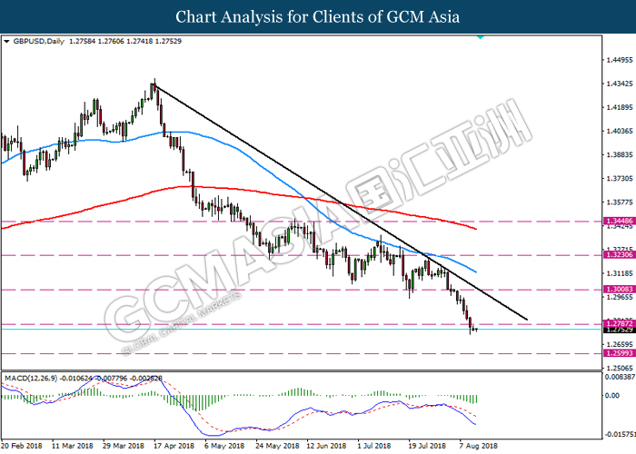 GBPUSD, Daily: GBPUSD remains traded within a descending channel following prior retracement from the top level. MACD histogram which begins to form bearish signal may suggests the pair to be traded lower in short-term, towards the direction of support level near 1.3045.