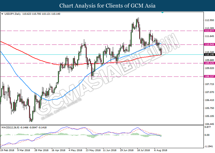 USDJPY, Daily: USDJPY was traded lower following prior breakout from the upward trendline. However, MACD histogram which illustrate diminished downward momentum may suggests the pair to extend its gains in short-term after closing above the threshold of 111.00.